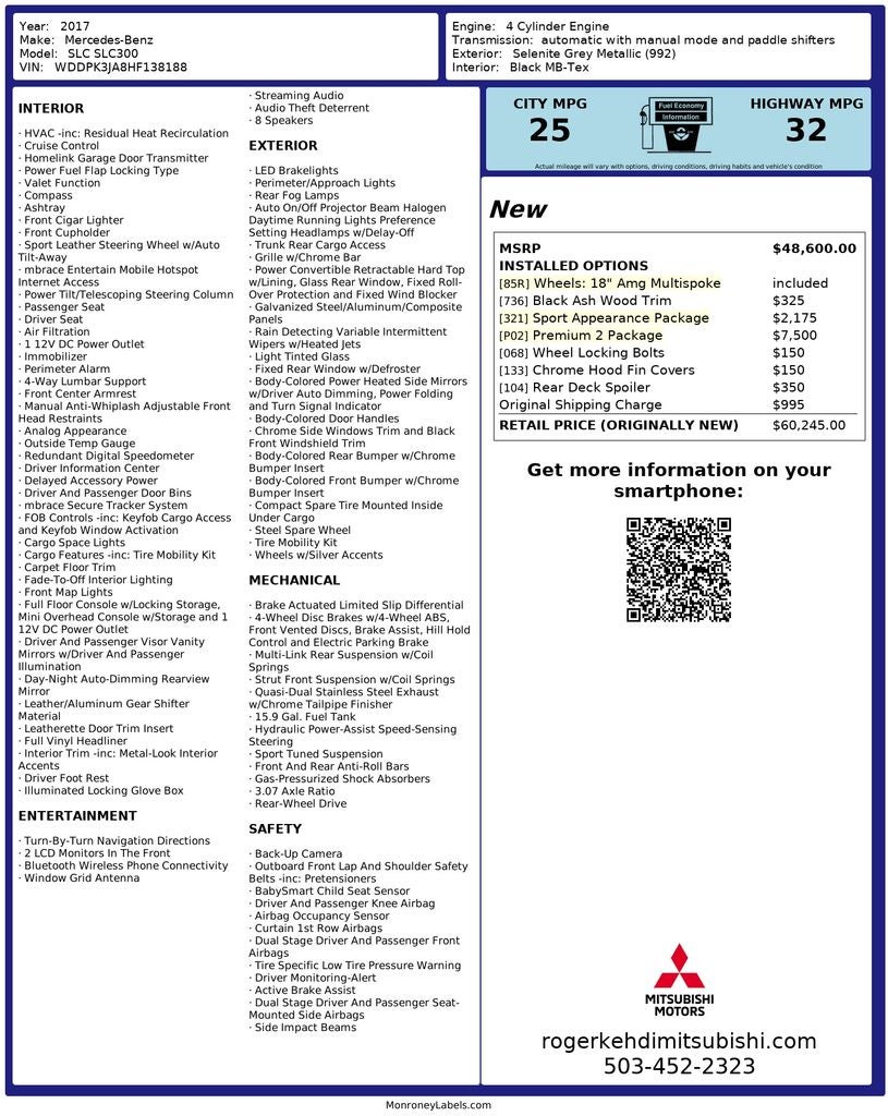 Experience the thrill of driving with the 2017 Mercedes-Benz SLC-Class SLC300, a stunning pre-owned convertible available for sale at Roger Kehdi Mitsubishi in Tigard, OR. This sleek two-door cabriolet is powered by a responsive 2.0-liter inline-four engine paired with a smooth 9-speed automatic transmission, delivering an exhilarating rear-wheel-drive experience.
