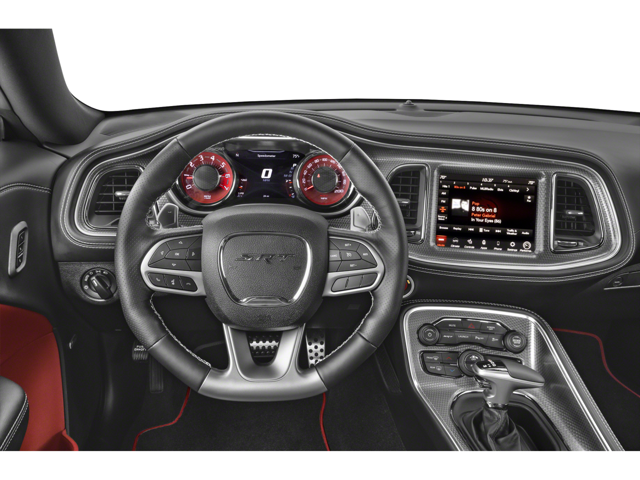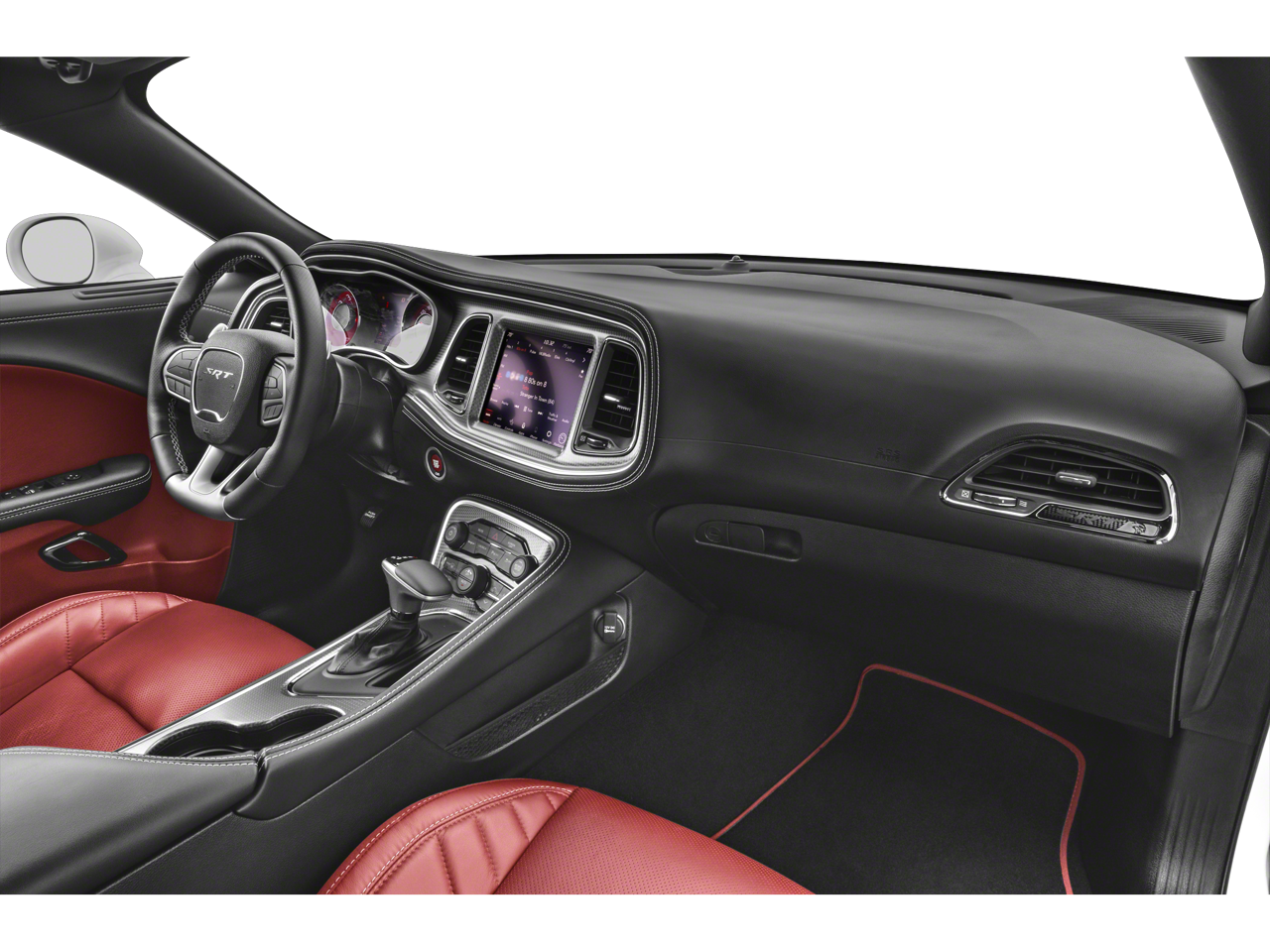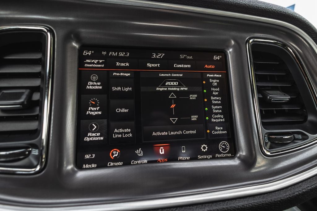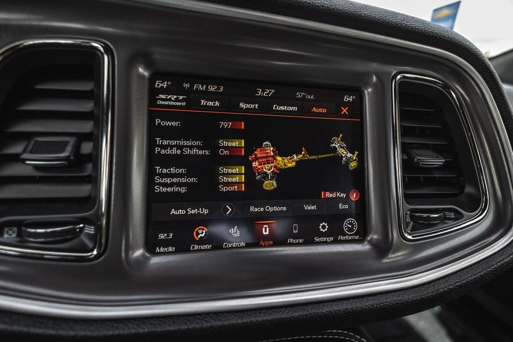 Inside, the **black interior** offers a premium, driver-focused cockpit with performance-inspired design, supportive seating, and modern technology. Equipped with **Apple CarPlay, Android Auto, premium infotainment, and advanced performance controls**, this Challenger blends classic muscle car feel with modern convenience and connectivity.